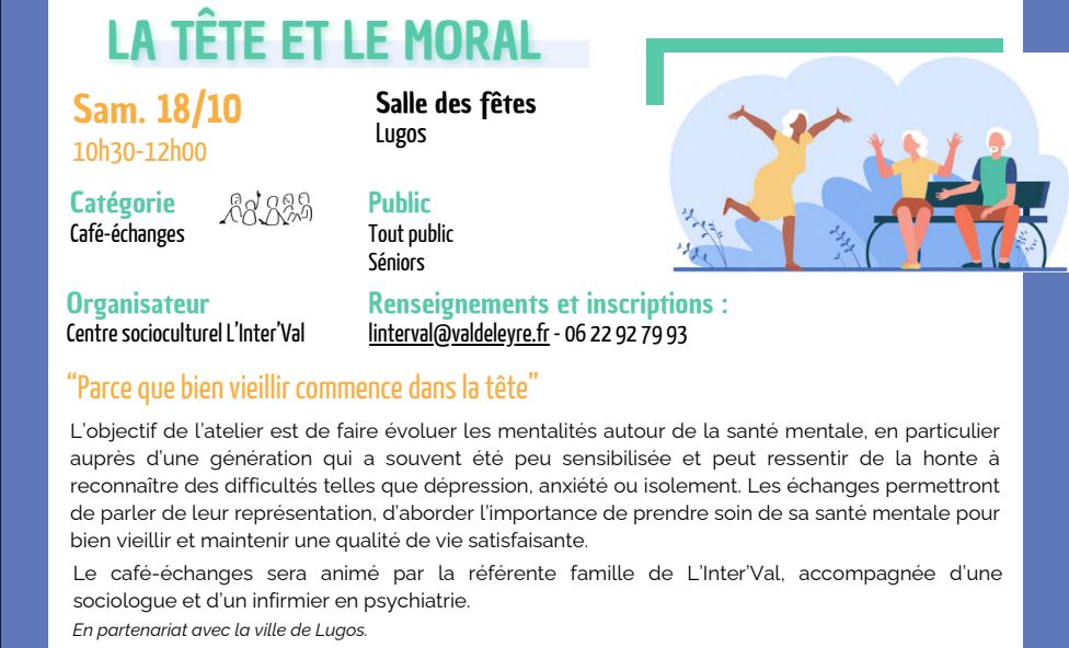 Un moment convivial pour échanger, partager des expériences et lever les tabous autour de la santé mentale. Le café-échanges sera animé par la référente famille de L’Inter’Val, accompagnée d’une sociologue et d’un infirmier en psychiatrie.