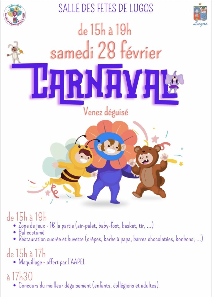 CARNAVAL Le 28/02/2026 CARNAVAL DE LUGOS ORGANISÉ PAR L’AAPEL AURA LIEU LE SAMEDI 28 FÉVRIER À LA SALLE DES FÊTES DE LUGOS DÈS 15H… Facebook