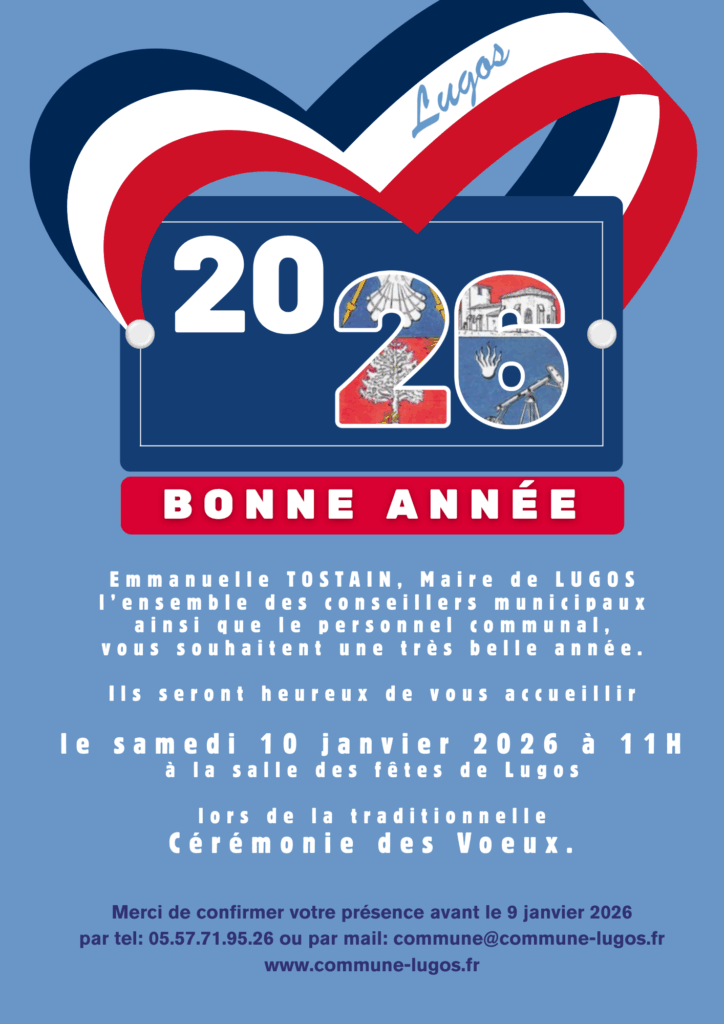 Et seront heureux de vous accueillir le samedi 10 janvier 2026 à 11h à la salle des fêtes de Lugos lors de la traditionnelle cérémonie des vœux.