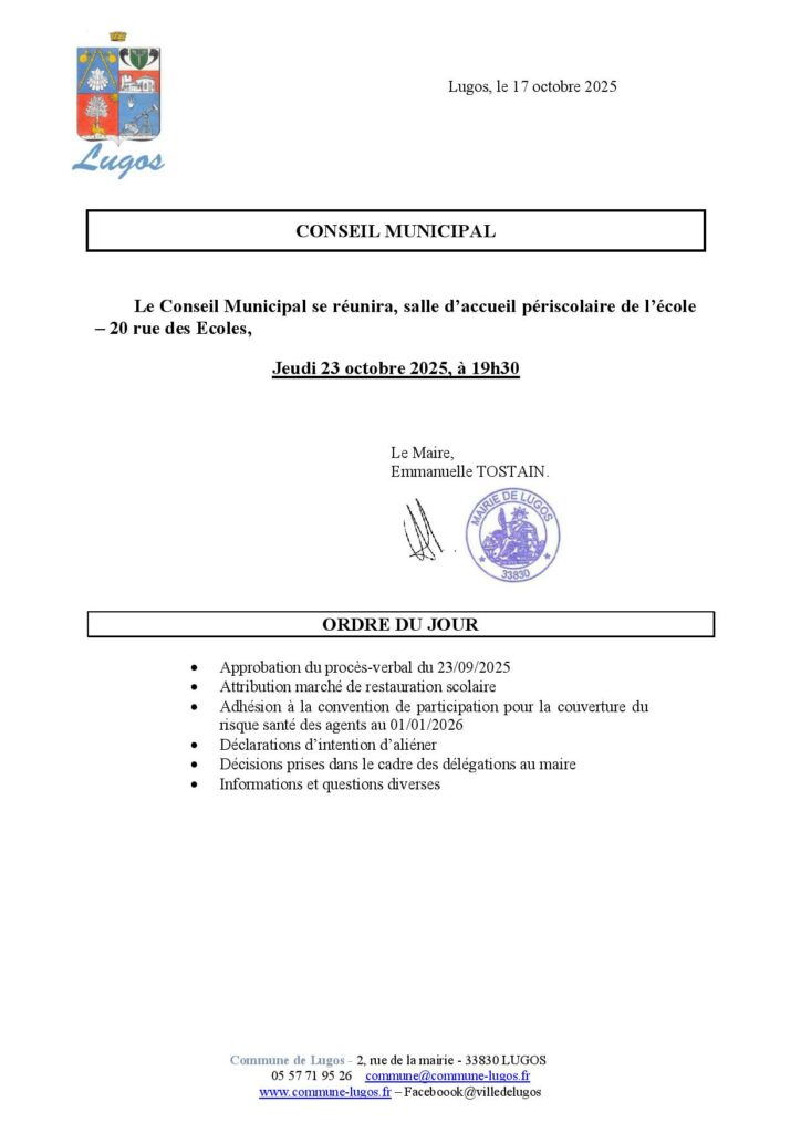 CONSEIL MUNICIPAL Le 23/10/2025 JEUDI 23 OCTOBRE 2025 À 19H30 SE TIENDRA LE PROCHAIN CONSEIL MUNICIPAL EN SALLE D’ACCUEIL PÉRISCOLAIRE DE L’ÉCOLE – 20 RUE DES ÉCOLES…