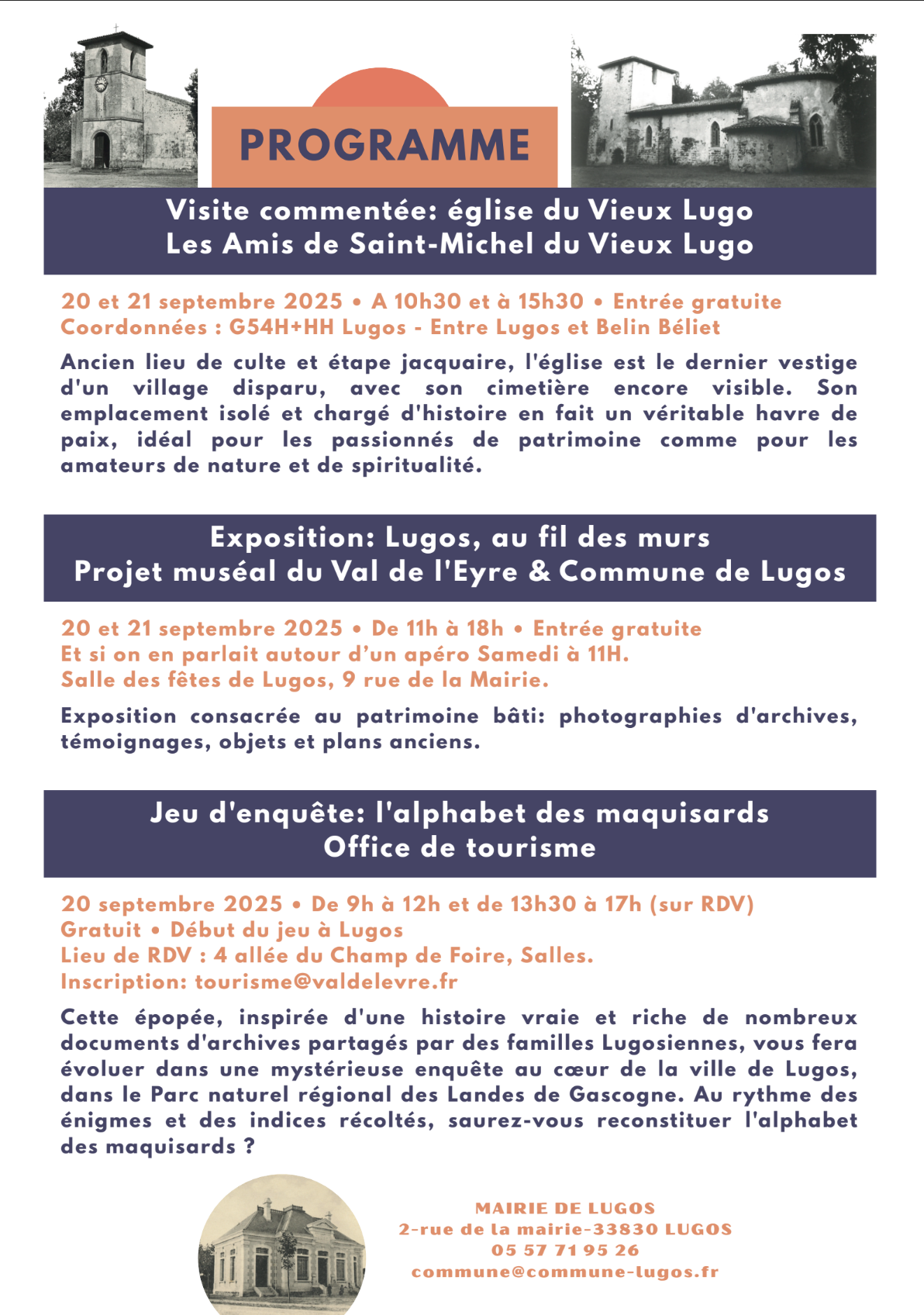 RETROUVEZ À LUGOS ET DANS LE VAL DE L’EYRE TOUT LE PROGRAMME DES JOURNÉES EUROPÉENNES DU PATRIMOINE SE TIENDRONT LES 20 ET 21 SEPTEMBRE 2025…